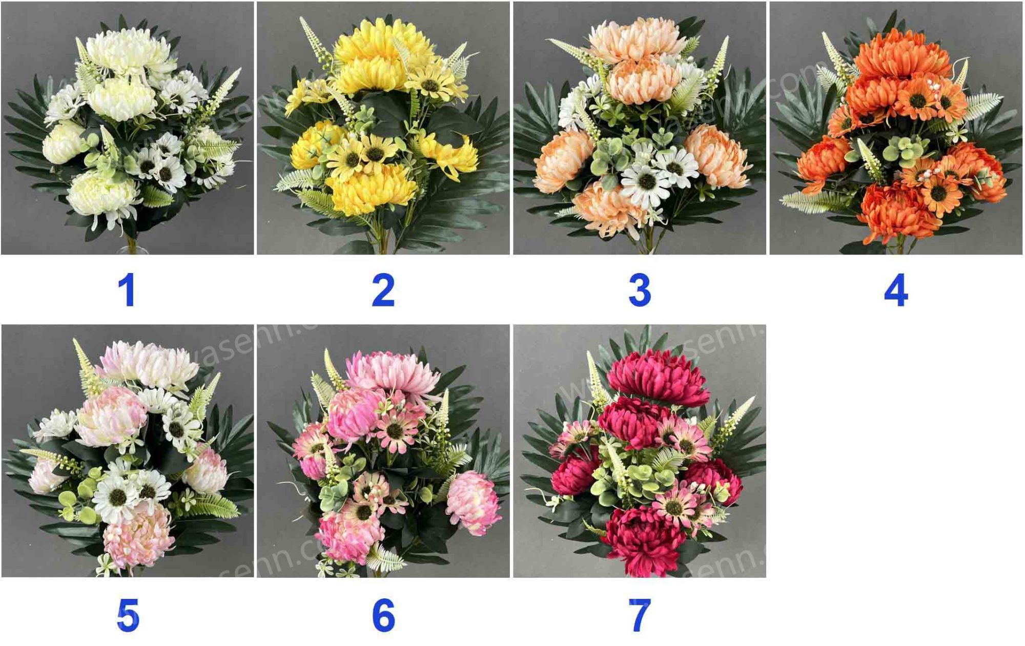 HEIGHT 46CM / 11 MUM / 1 BIG FLOWERS 4 SMALL FLOWERS 9 DAISY 2 FITTINGS /DIA 13CM 10CM 5CM /16,10,2 LAYERS/ PONGEE PLASTICS / 8 LEAVES