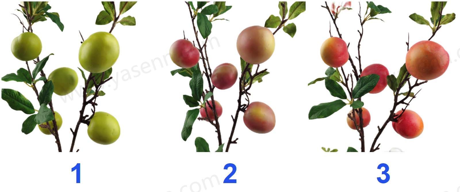Description:HEIGHT 75CM/2 BRANCHES PLUM/4PCS BIG FRUITS 2PCS SMALL FRUITS/DIA 4.5CM 4CM/FOAM/8PCS LEAVES