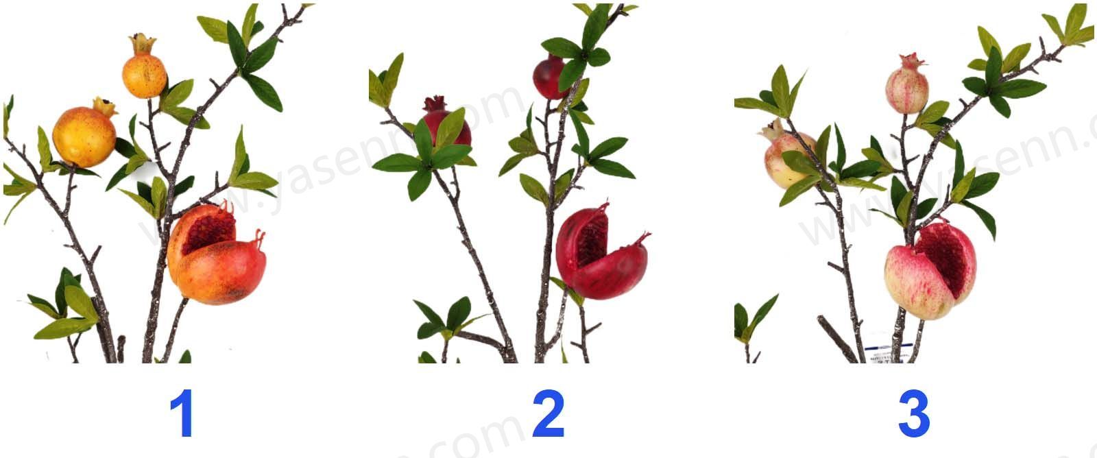 Description:HEIGHT 103CM/2 BRANCHES POMEGRANATE/3PCS BIG FRUITS 2PCS MEDIUM FRUITS 1PCS SMALL FRUIT/DIA 7CM 4.5CM 3.5CM/FOAM/21PCS LEAVES